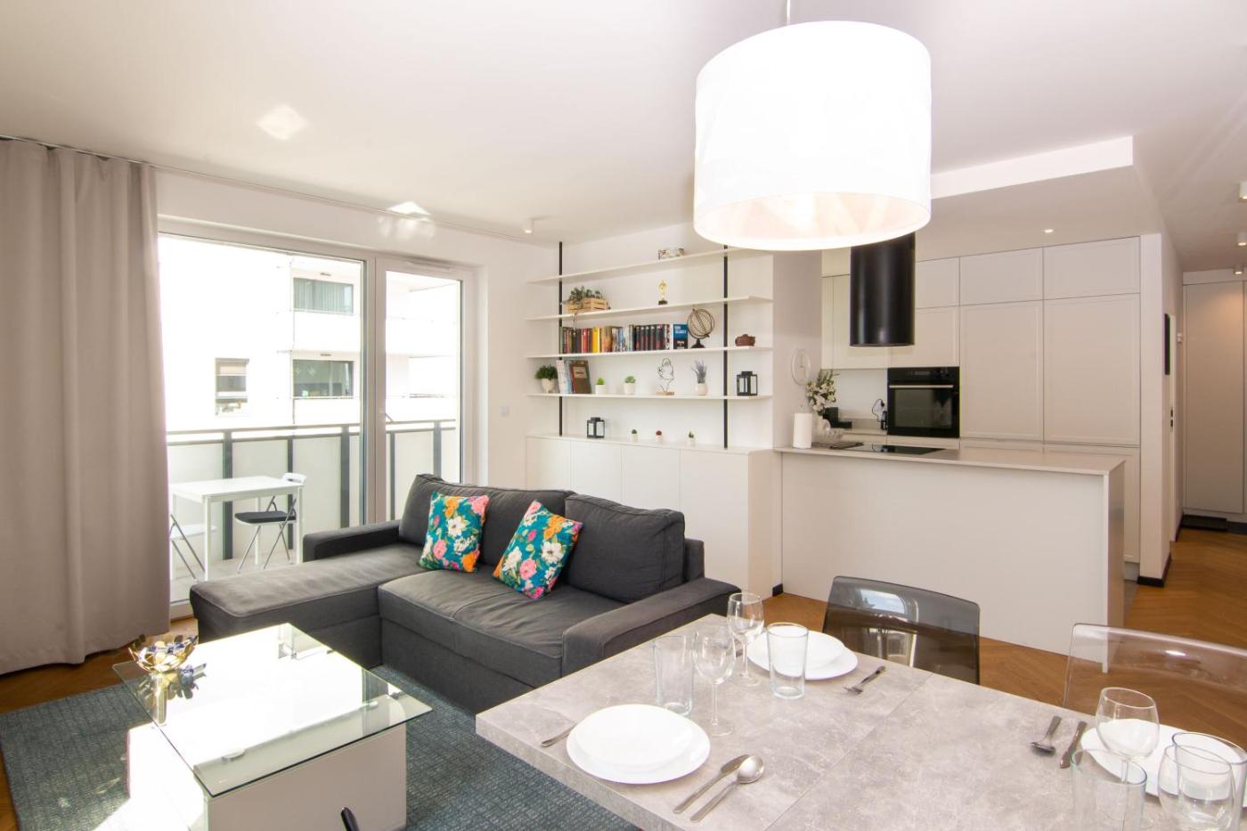 Oferta apartamentu obejmuje kilka sypialni (2), salon, kuchnię z pełnym wyposażeniem, w tym lodówką i ekspresem do kawy, a także łazienkę (1) z prysznicem oraz suszarką do włosów. W apartamencie zapewniono ręczniki i pościel.